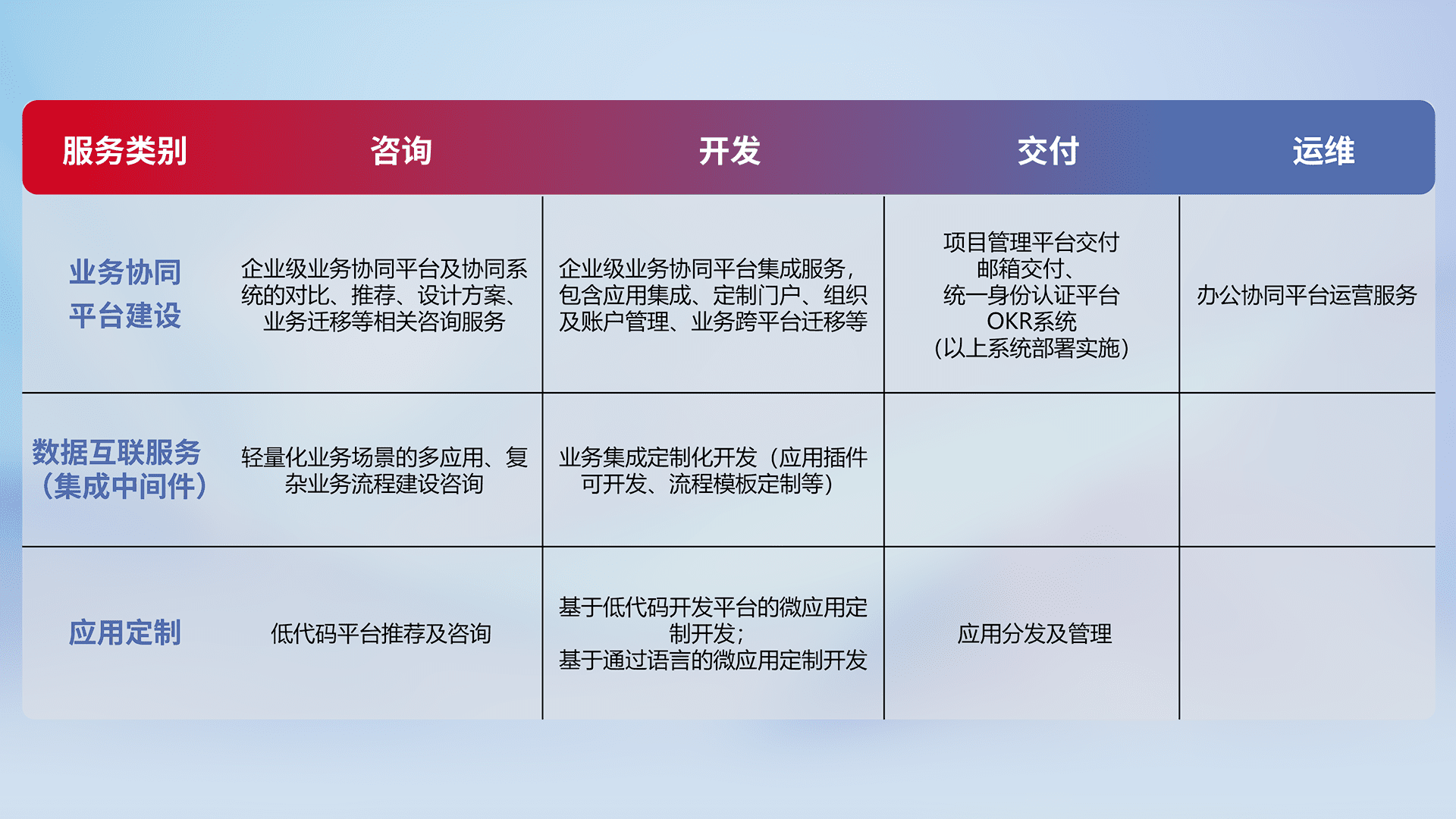针对钉钉、、、企微、、IDaas等平台级产品提供产品的规划、、方案、、、交付、、、、定制化开发等服务,,,,实现如统一协同办公、、、智能客户服务、、、混合会议管理、、、智能数据查询、、、、等业务场景,,,,实现数字化转型。。。。